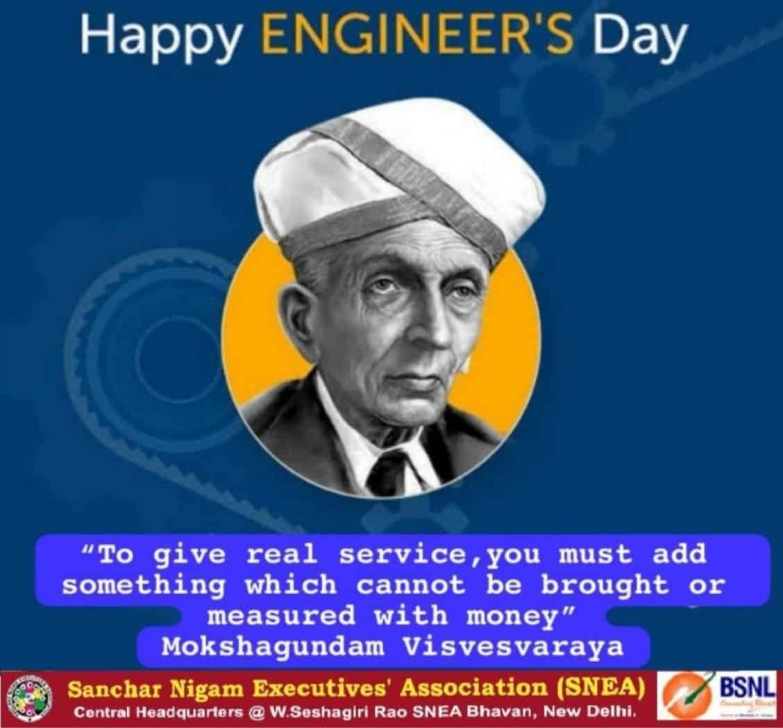 Happy Engineers Day 2025 Happy Engineers Day 2025 September 15, 2025 National events 17 Views Last Updated: September 22, 2025 Happy Engineers Day 2025 SNEA CHQ September 15, 2025 Previous Article AGM TM BRABRITT Jabalpur writes to all Circle Heads regarding cancellation, rescheduling and relocation of EPP Batches of Quarter-3 (2025-26) from RTTC Jaipur to BRBRAITT Jabalpur: Next Article Respectful Homage to Com. Islam Ahmed, Former President NFTE CHQ: